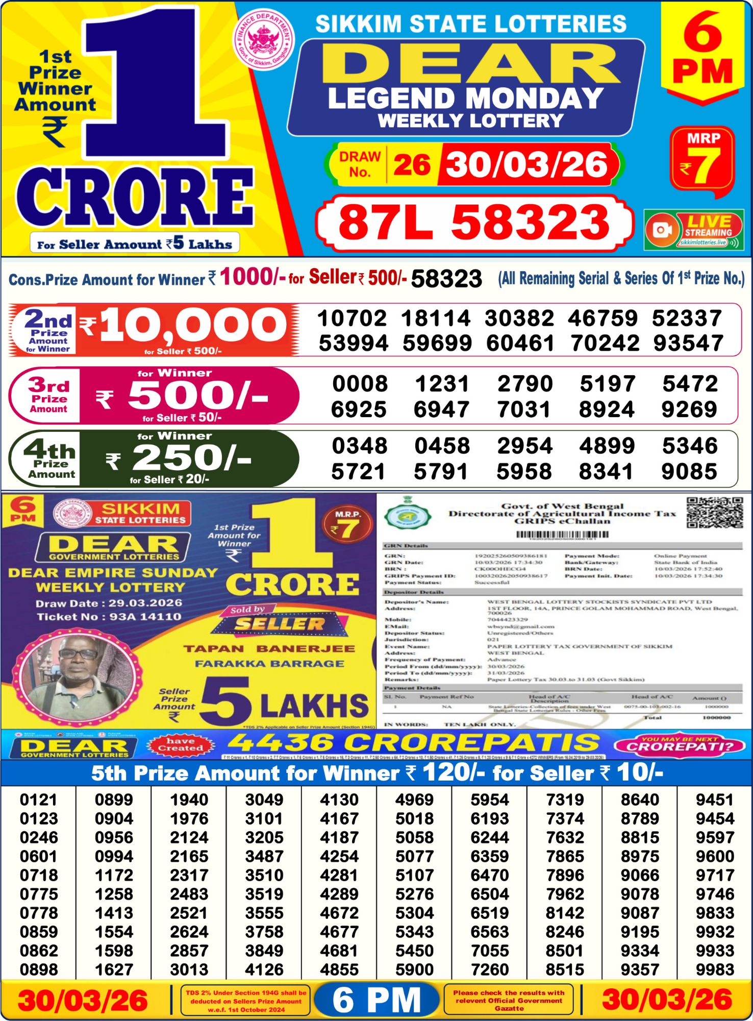 Dear Legend Monday (6:00 PM) - Evening Result For 30-03-2026